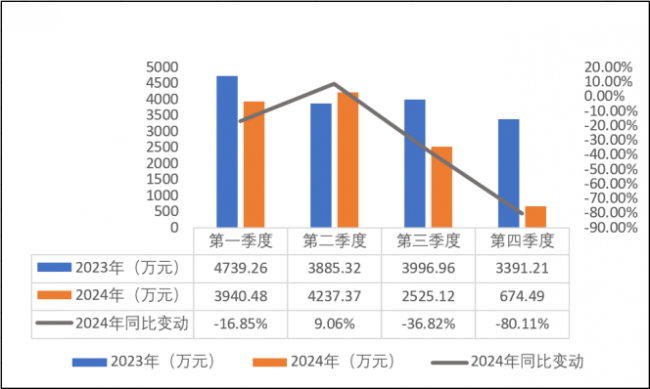 数据显示,公司第四季度实现营业总收入8.10亿元,同比下降2.90%,环比下降4.86%;归母净利润674.49万元,同比下降80.11%,环比下降73.29%;扣非净利润1195.50万元,同比下降49.61%,环比下降46.51%。