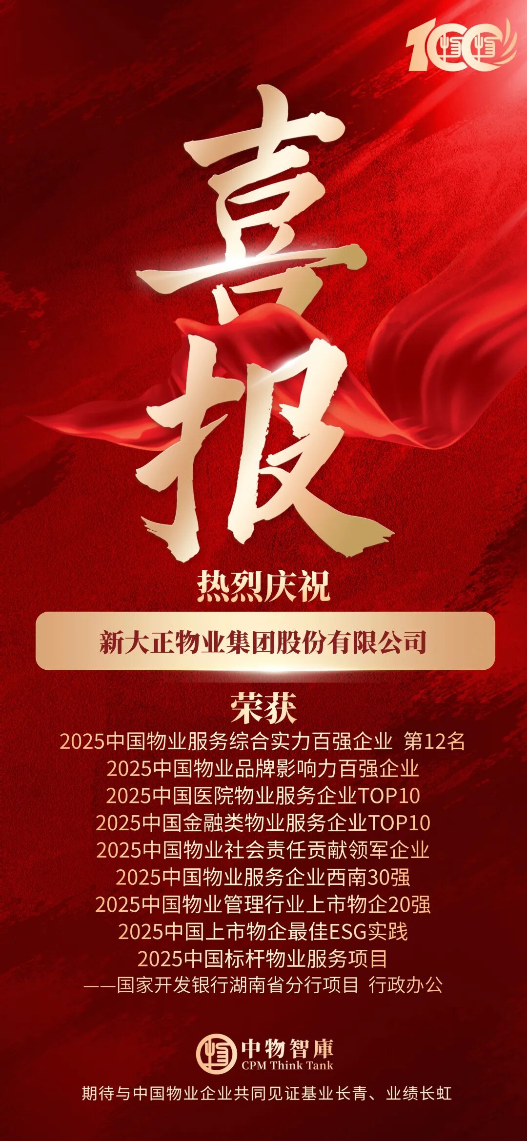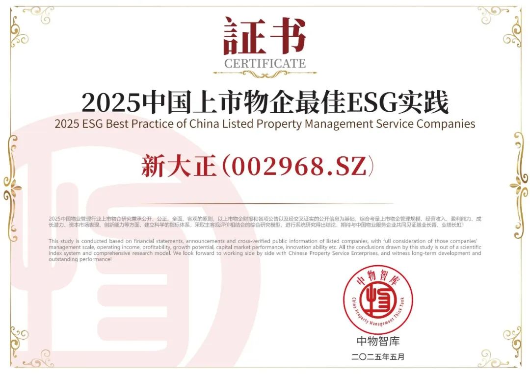 会上,发布《2025中国物业百强企业研究报告》,同期重磅发布“2025中国物业服务综合实力百强企业”、“2025中国物业品牌影响力百强企业”及系列专项榜单。新大正凭借卓越的综合实力、创新服务模式及社会责任担当,一举斩获“2025中国物业服务综合实力百强企业第12名”、“2025中国物业品牌影响力百强企业”、“2025中国医院物业服务企业TOP10”、“2025中国金融类物业服务企业TOP10”、“2025中国物业服务企业西南30强”、“2025中国物业管理行业上市物企20强”、“2025中国标杆物业服务项目―国家开发银行湖南省分行项目(行政办公)”等九项殊荣。其中,新大正首次斩获“2025中国物业社会责任贡献领军企业”、“2025年中国上市物企最佳ESG实践”荣誉称号,彰显了行业对新大正社会责任价值的高度认可。