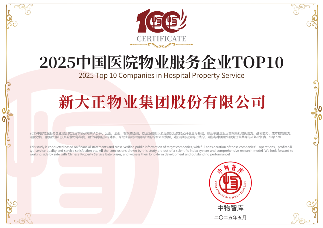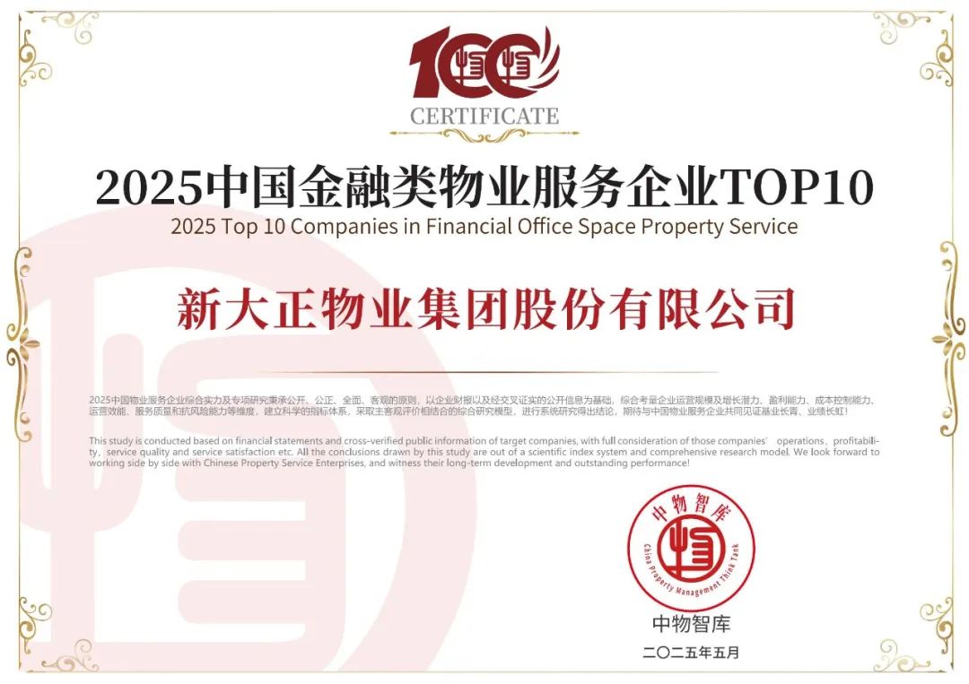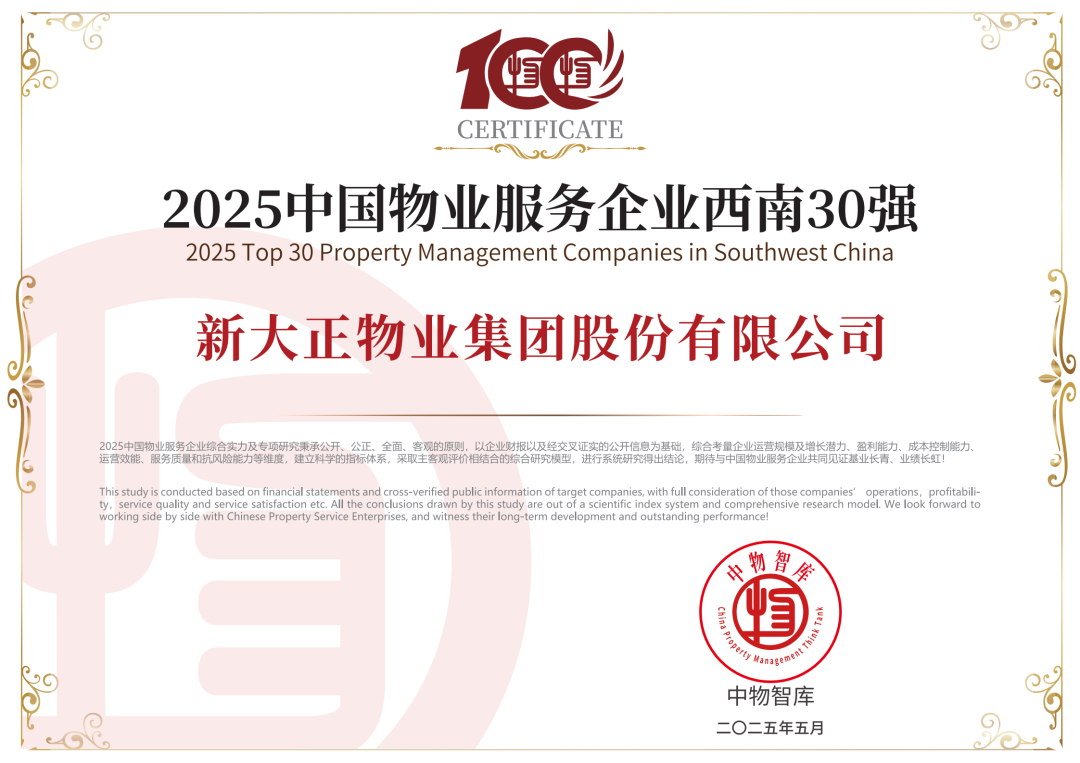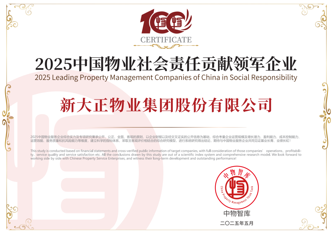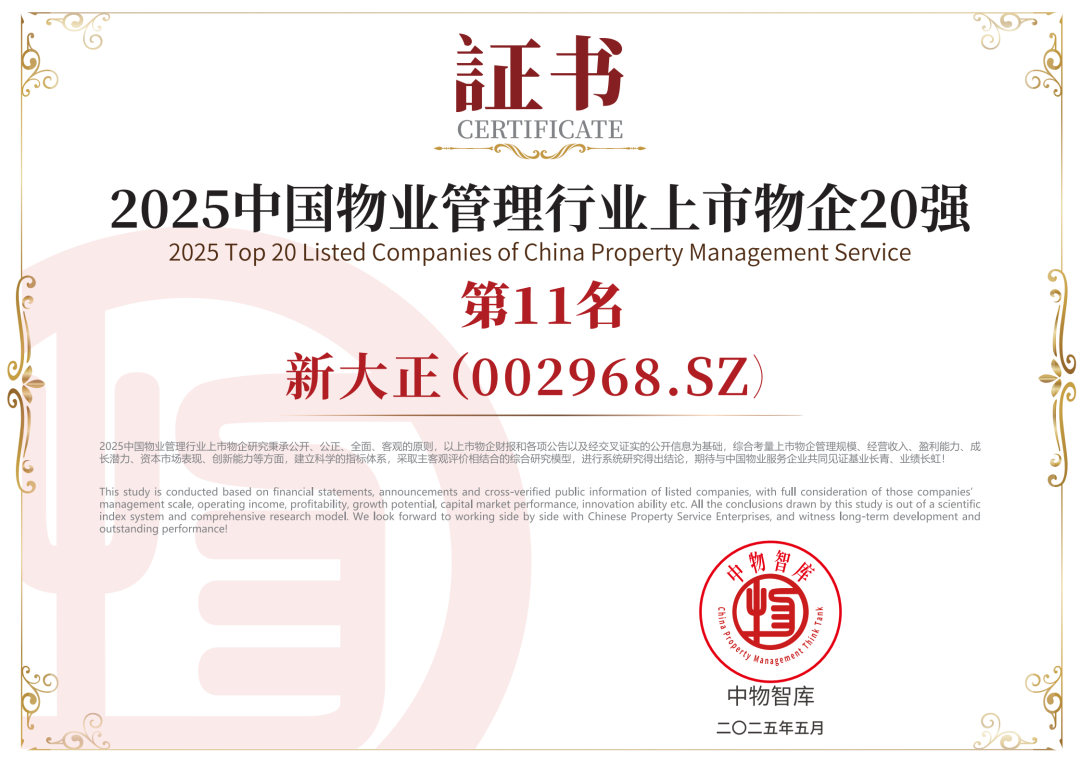 此次荣誉加冕,也是新大正连续三年蝉联“中国物业服务综合实力百强企业”TOP12,是认可,更是前进的动力。新大正将持续深化“以人为本”的行为宗旨,以客户需求为导向、以员工成长为基础、以可持续发展为根基,恪守“真诚专业、不负所托”的服务理念。通过加速数字化转型,构建“智慧+AI”生态、拓展“物业+城市服务”创新模式等,为企业和行业高质量发展注入创新动能,为推动城市美好生活贡献智慧与力量!