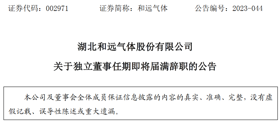 和远气体(002971)于9月20日发布晚间公告称,湖北和远气体股份有限公司(以下简称“公司”)董事会于 2023 年 9 月 20 日收到公司独立董事李国际先生、袁有录先生、向光明先生提交的书面辞职报告。李国际先生、袁有录先生、向光明先生因连续担任公司独立董事时间将于 2023 年 10 月 17 日满六年,根据《上市公司独立董事管理办法》规定,三位独立董事须辞去其分别担任的公司第四届董事会独立董事职务;辞去公司独立董事职务后,均不再担任公司第四届董事会专门委员会委员。