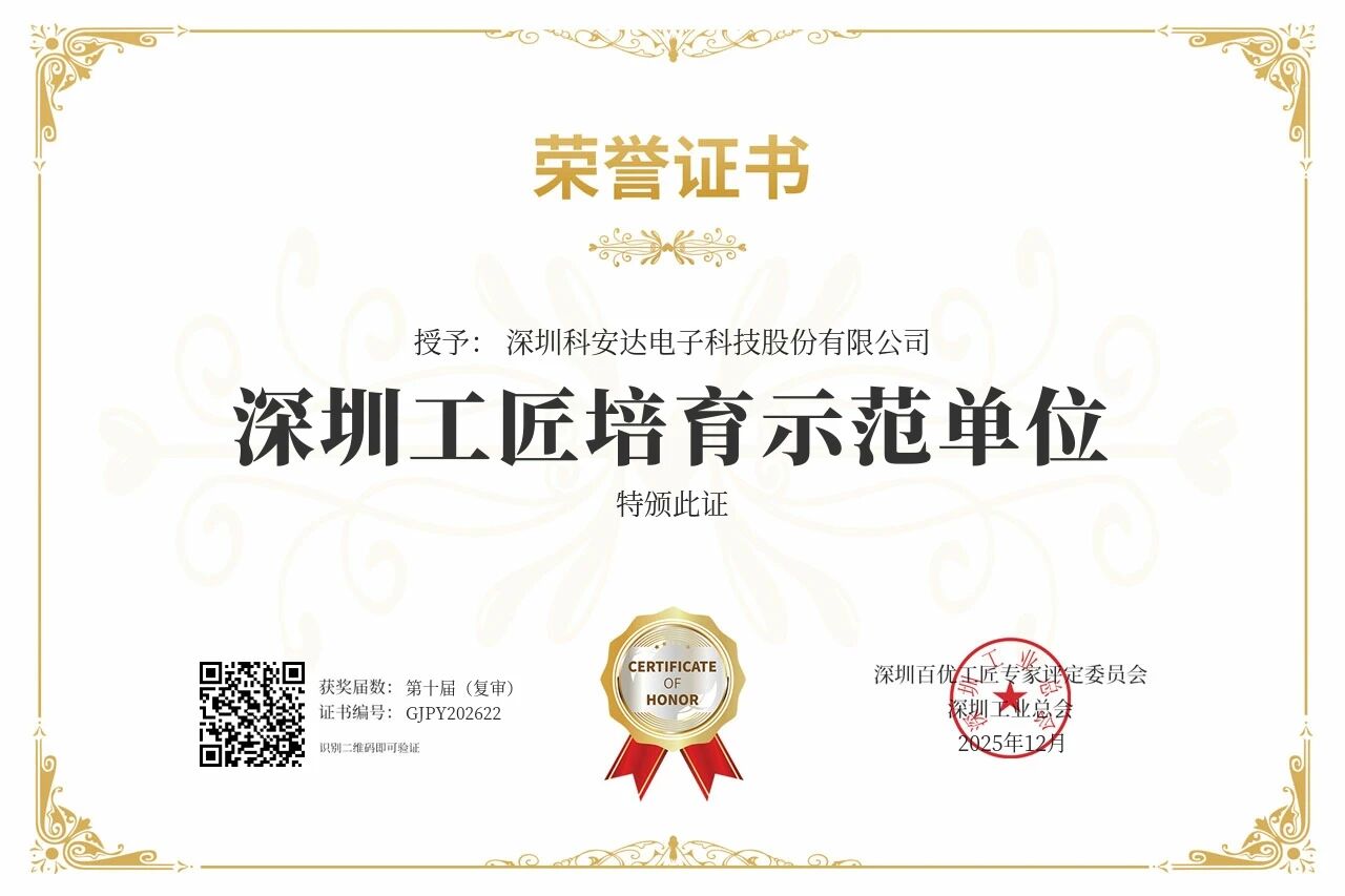 近日,深圳科安达电子科技股份有限公司(股票代码:002972)凭借在高技能人才培养方面的扎实工作与显著成效,成功通过复审,再次获评“深圳工匠培育示范单位”。这标志着公司长期坚持的“人才驱动创新”战略获得了持续性的权威认可。
