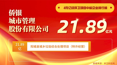 近日,4月亿级环卫项目中标企业排行榜出炉。环卫科技网显示,侨银股份以中标额21.89亿元位列第一;位列第二至第五名分别是张家口众联集团、中环洁、深能环保?、江西水投康赣环保产业集团。