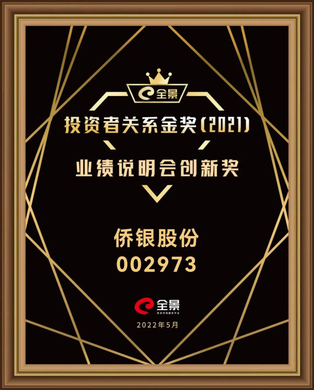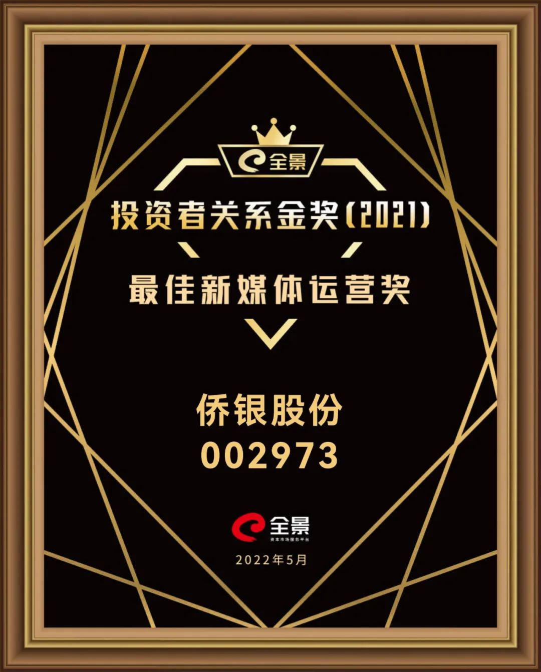 近日,由全景网主办的2021年度全国“投资者关系金奖”系列奖项榜单揭晓,侨银股份荣获“业绩说明会创新奖”和“最佳新媒体运营奖”。