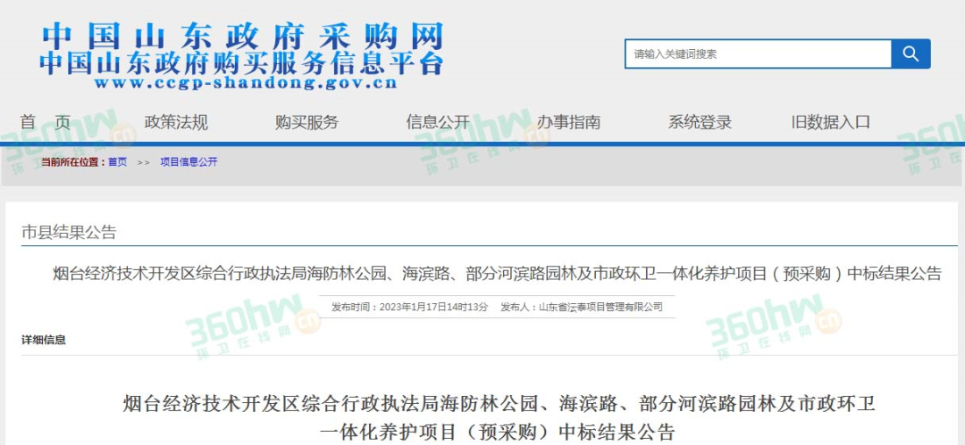 1月17日,山东省政府采购网发布烟台经济技术开发区综合行政执法局海防林公园、海滨路、部分河滨路园林及市政环卫一体化养护项目中标结果公告。