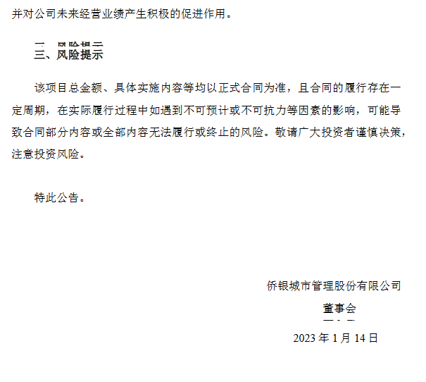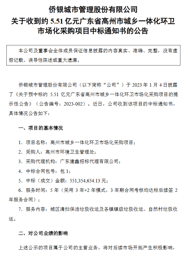 侨银股份(002973)公布,公司于2023年1月4日披露了《关于预中标约5.51亿元广东省高州市城乡一体化环卫市场化采购项目的提示性公告》。近日,公司收到该项目的中标通知书。中标(成交)金额:约5.51亿元。