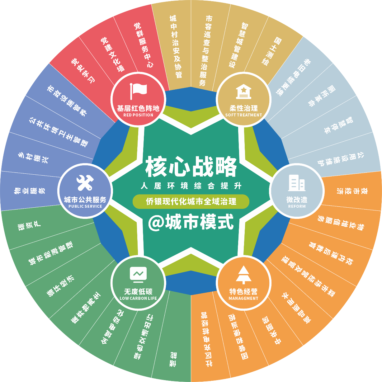 围绕核心战略,侨银股份紧跟国家社会的发展步伐,从聚焦环卫一体化逐步迭代升级为城市大管家,并创新提出“@城市”治理模式,构建集城市公共服务、微改造、特色经营等为一体的现代化城市全域治理服务新体系,以“全区域”“全周期”“全要素”服务,助力城市焕新升级。
