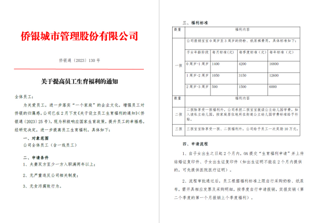 近日,一份侨银股份新出台的《关于提高员工生育福利的通知》流出,瞬间爆火全网引发热议,网友纷纷大呼“神仙公司还招人吗?”“报上地址,让我来!”