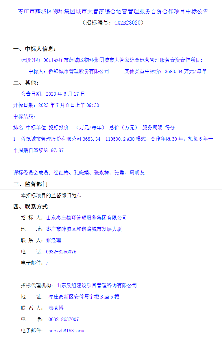北极星环卫网获悉,2023年7月9日,枣庄市薛城区物环集团城市大管家综合运营管理服务合资合作项目公布中标结果,中标供应商为侨银城市管理股份有限公司,中标金额为3683.34万元/年,合作年限30年,服务总费用110500.2万元。