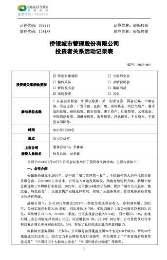 侨银股份向投资者介绍了公司情况。侨银股份成立于2001年,是中国“城市管理第一股”、全国领先的人居环境综合提升服务商。自2020年上市以来,公司迈入高速发展阶段,战略持续迭代升级,新增中标总额连续三年蝉联行业桂冠。2022年,公司推出城市子品牌,聚焦“城市公共服务、微改造、特色经营”,全面加快产业链延伸布局,实现了从服务城市、管理城市到经营城市的迭代升级。