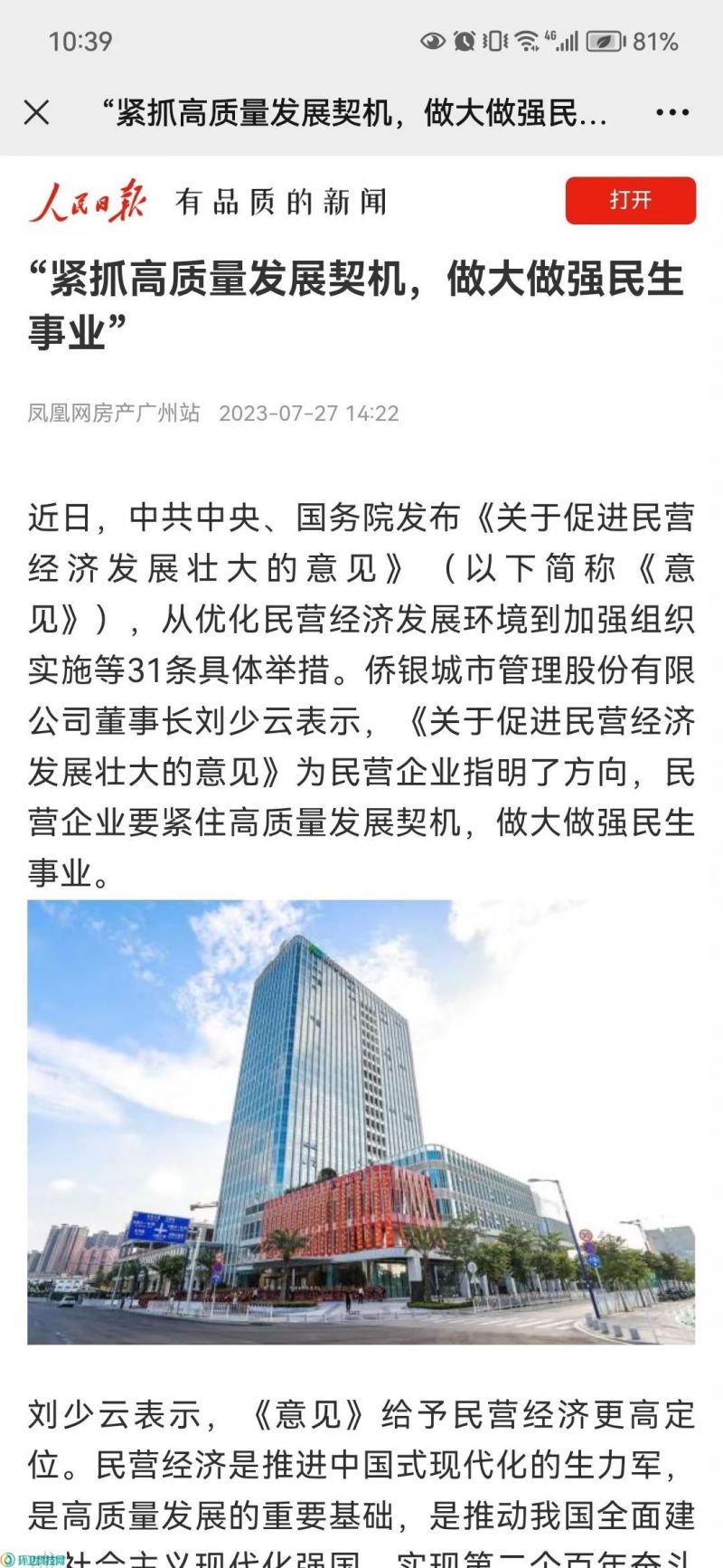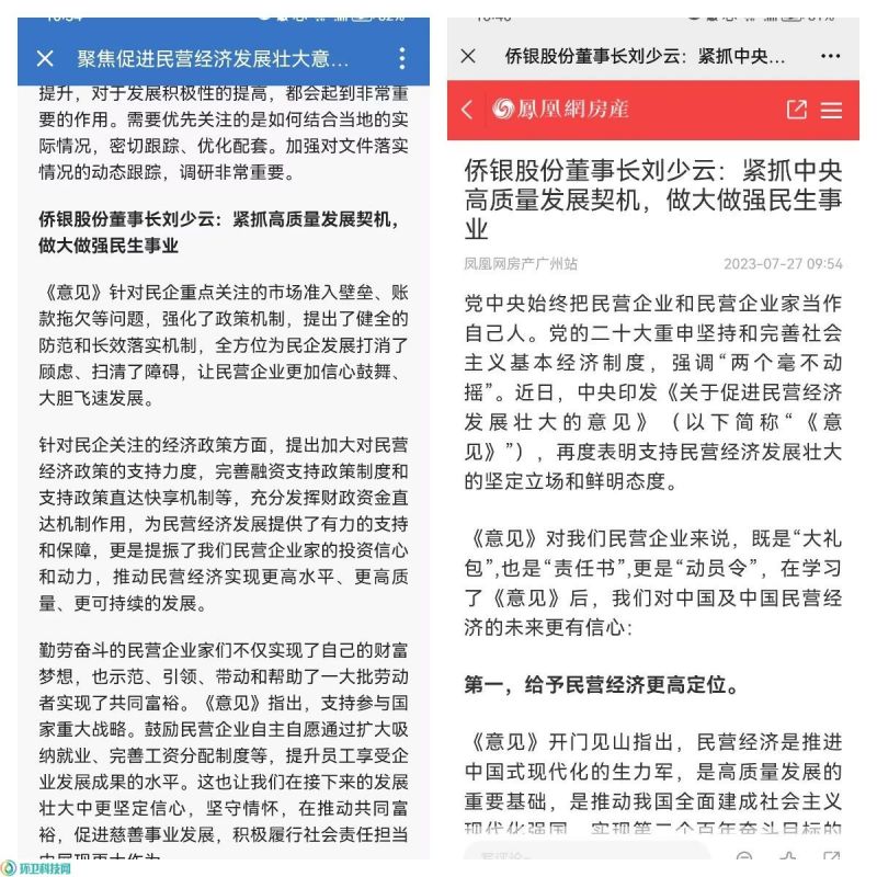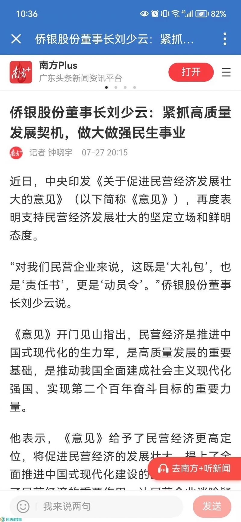《中共中央国务院关于促进民营经济发展壮大的意见》(以下简称《意见》)近日发布后,在民营企业中引起积极反响,人民日报、南方日报、每日经济新闻、凤凰网等多家权威媒体相继报道侨银股份董事长刘少云的感想《紧抓高质量发展契机,做大做强民生事业》。