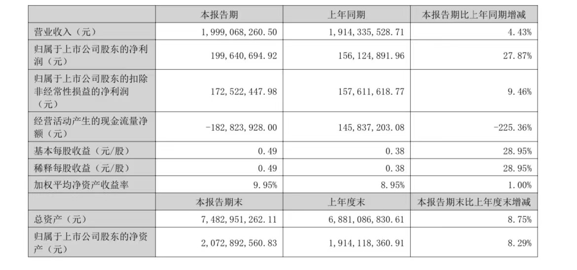 根据公告,公司实现营业收入19.99亿元,同比增长4.43%;归属于上市公司股东的净利润2亿元,同比增长27.87%。