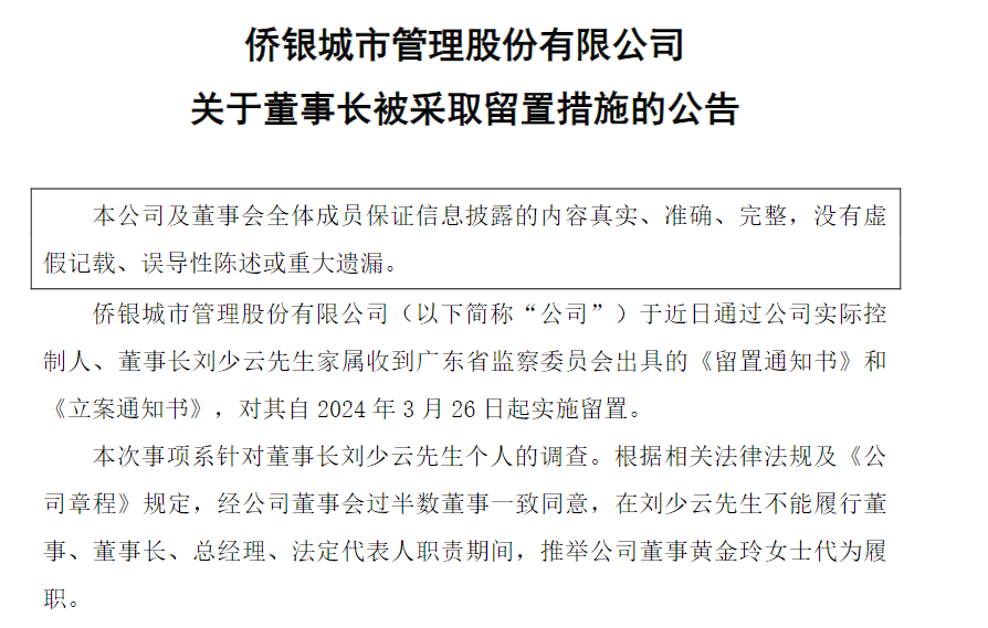 跟着公司财报一同披露的还有两则公告值得重视,一是《关于董事长被采取留置措施的公告》;二是《关于高级管理人员离职的公告》: