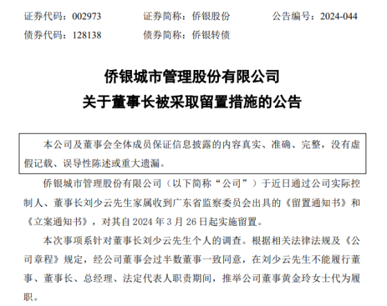 日前,侨银股份公告称,公司近日通过实际控制人、董事长刘少云家属收到广东省监察委员会出具的《留置通知书》和《立案通知书》,对其自2024年3月26日起实施留置。