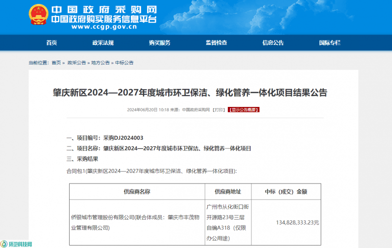 6月20日,肇庆新区2024—2027年度城市环卫保洁、绿化管养一体化项目开标,侨银城市管理股份有限公司(联合体成员:肇庆市丰茂物业管理有限公司)中标,中标金额134,828,333.23元,服务期3年。