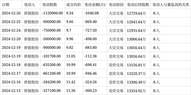 深交所公开信息显示,12月26日,侨银股份董事郭倍华在大宗交易公司股票,减持股数112.00万股,成交均价9.34元,变动金额1046.08万元,变动后持股数为12729.64万股。