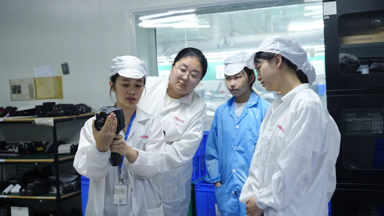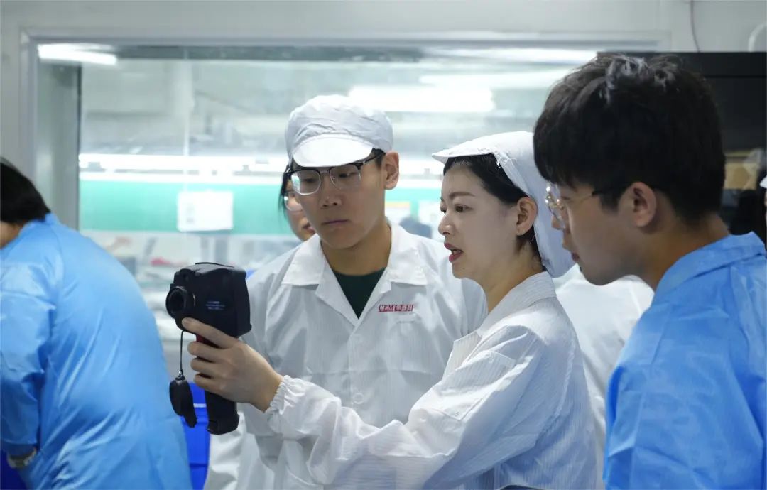 在华盛昌技术人员的带领下,师生们参观了公司的实验室和生产车间。现场,各类先进的测量仪器吸引众多人的关注,从电力电子测量技术到红外测温和成像技术,从激光测距技术到环境检测技术,华盛昌展现出的技术实力和创新精神让师生们赞叹不已。通过实地观察与体验,学生们对现代工业系统的复杂性和精密性有了更直观的认识,对工业生产中的分工、协作与控制也有了更深刻的理解。