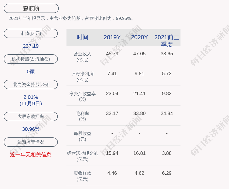 2021年半年报显示,森麒麟的主营业务为轮胎,占营收比例为:99.95%。