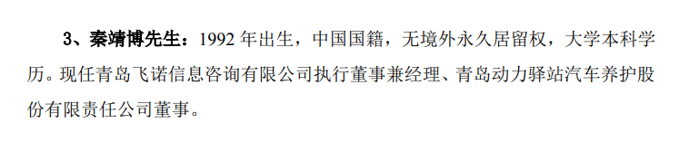从非独立董事简历中看到,秦靖博与现任董事长秦龙为父子关系。1992 年出生,中国国籍,无境外永久居留权,大学本科学历。现任青岛飞诺信息咨询有限公司执行董事兼经理、青岛动力驿站汽车养护股份有限责任公司董事。