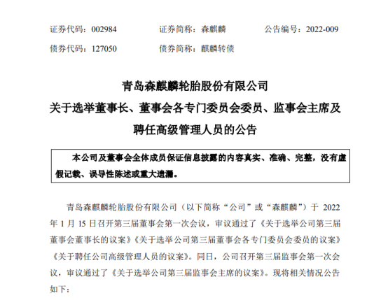 森麒麟表示,公司于1月15日召开第三届董事会第一次会议,审议通过《关于选举公司第三届董事会董事长的议案》《关于选举公司第三届董事会各专门委员会委员的议案》《关于聘任公司高级管理人员的议案》。同日,公司召开第三届监事会第一次会议,审议通过《关于选举公司第三届监事会主席的议案》。