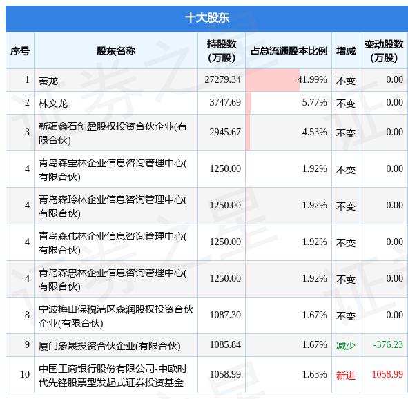 根据森麒麟2022年一季报公布的十大股东详情如下: