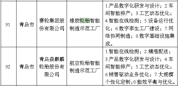 近日,工业和信息化部、国家发展改革委等多部门联合开展的2022年度智能制造示范工厂揭榜单位和优秀场景名单出炉。其中,安徽中鼎、山东玲珑轮胎、赛轮轮胎、森麒麟轮胎入选2022年度智能制造示范工厂揭榜单位公示名单。双星东风轮胎有限公司、青岛双星轮胎工业有限公司入选2022年度智能制造优秀场景公示名单。