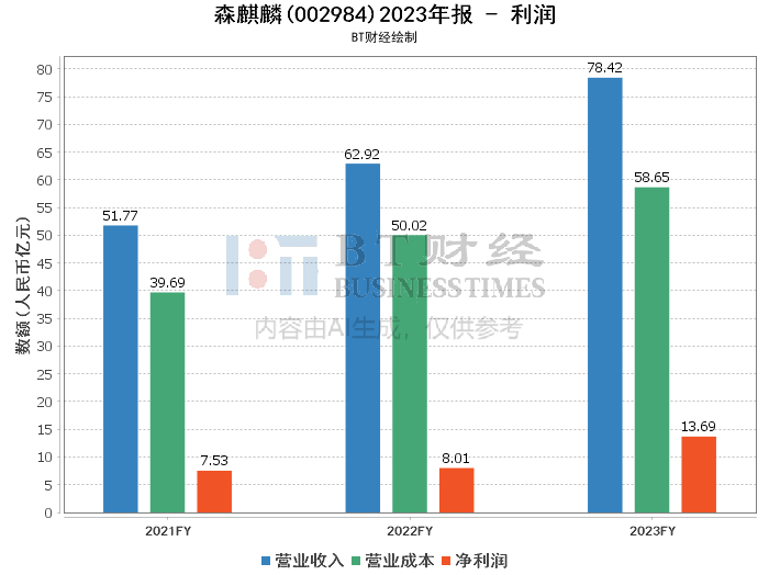 资产负债方面,森麒麟的总资产从2022年的111.16亿元增长至2023年末的156.5亿元,显示出公司资产规模的大幅扩张。负债总额也有所增加,从34.97亿元增至38.64亿元,但资产负债率从31.45%下降至24.69%,表明公司的财务结构更为健康。净资产从76.24亿元增长至117.86亿元,反映出公司净值的稳步提升。
