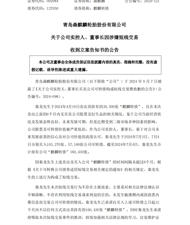 因秦龙先生上述卖出及买入公司“麒麟转债”的时间间隔未超过6个月,根据《关于可转换公司债券适用短线交易相关规定的通知》的相关规定,秦龙先生的上述行为构成了短线交易。秦龙先生本次短线交易行为不存在主观故意,主要系对相关法律法规认识不够清晰,不存在利用短线交易谋求利益的目的,未发生敏感期内或因获悉内幕信息而交易公司可转债的情况。秦龙先生已承诺自买入上述可转债之日起12个月内不以任何方式卖出其持有的160,430张“麒麟转债”。同时秦龙先生承诺将吸取本次短线交易事件的教训,持续加强相关法律法规的学习,自觉维护证本公司及董事会全体成员保证信息披露内容的真实、准确和完整,没有虚假记载、误导性陈述或重大遗漏。券市场秩序,杜绝此类行为的再次发生。