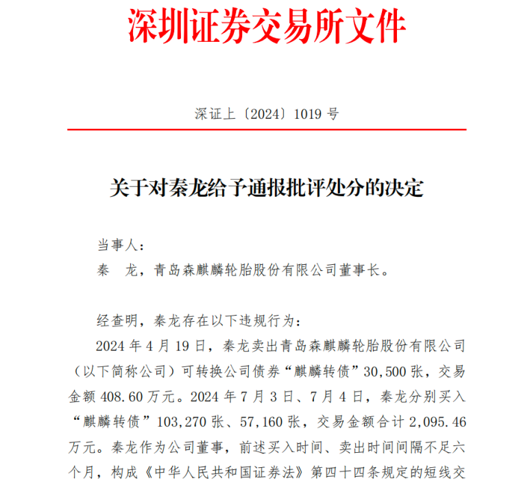 深圳证券交易所(以下简称“深交所”)于2024年11月29日发布《关于对秦龙给予通报批评处分的决定》的公告和森麒麟2024年11月30日发布《关于公司实控人、董事长因涉嫌短线交易收到立案告知书的公告》。两份公告显示,森麒麟董事长实际控制人秦龙进行纪律处分决定和2024年11月29日,秦龙先生收到中国证券监督管理委员会(以下简称“中国证监会”)出具的《中国证券监督管理委员会立案告知书》(编号:证监立案字0242024014号),根据《中华人民共和国证券法》《中华人民共和国行政处罚法》等法律法规,中国证监会决定对秦龙先生因涉嫌短线交易予以立案。目前公司各项生产经营活动均正常有序进行。