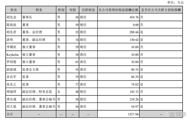 年报显示,公司董事、监事和高级管理人员2021年报酬总额为1527.96万元。董事长胡先念2021年从公司获得报酬为454.76万元,董事、总经理胡先君2021年从公司获得报酬为288.66万元,副总经理、董事会秘书谭良谋2021年在本公司领取薪酬为210.26万元。