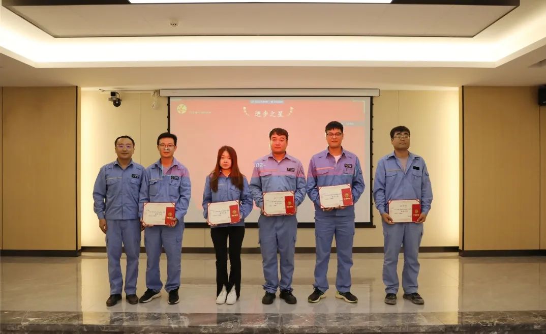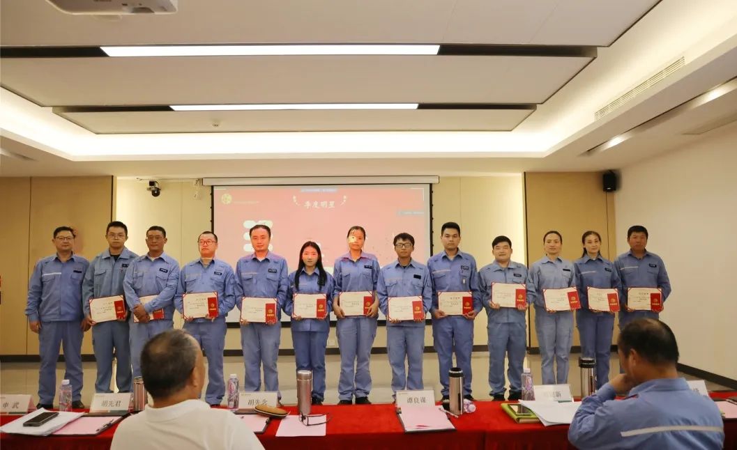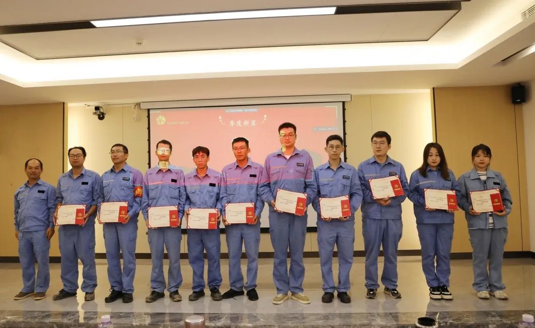 在2023年第二季度的各项工作中,部分员工表现优异、进步较大,分别被评为“季度明星”“进步之星”“季度新星”;同时,为更好地适应公司发展和岗位需要,公司进行了组织架构和人事调整。会议上,宇新股份总经理助理刘建新宣读了评优表彰决定、公司架构调整和职务任免红头文件。公司领导们为获奖员工颁发了证书、奖金并合影留念。