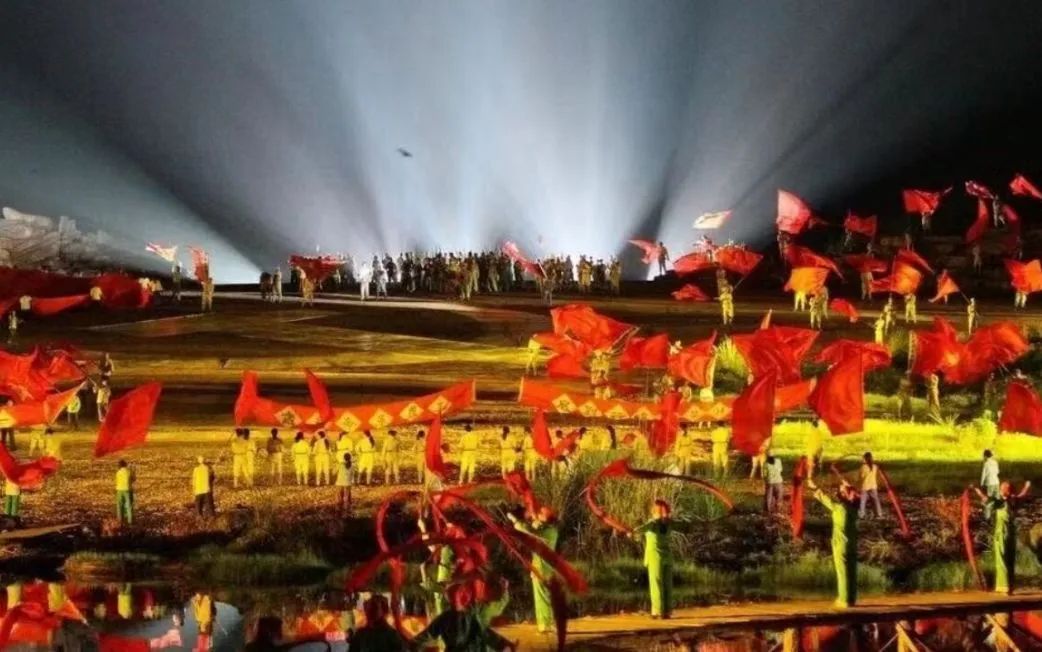 党员队伍来到了露天的红军剧场。华灯初上,大家集体观看大型实景歌舞史诗——《井冈山》。剧情共分为《血》《旗》《灯》《情》《火》《路》六个章节,通过红军后代,即井冈山儿女的叙述,展现了1927年那段永不磨灭的历史记忆。600多名拿山乡、厦坪镇的农民,身为当年的红军和赤卫队员的后代,他们用自己的真情实感,还原历史,为我们带来一场视听盛宴。