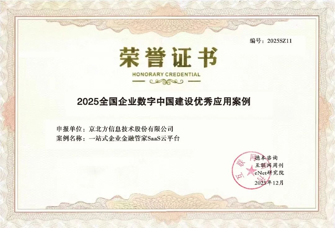 近日,由互联网周刊、德本咨询、eNet研究院联合联合评选的“2025全国企业数字中国建设优秀应用案例”正式发布,京北方“一站式企业金融管家SaaS云平台”凭借卓越的技术创新能力、丰富的场景落地经验及显著的数字化赋能成效一举斩获该奖项。此次获奖,标志着京北方在助力企业数智化转型、推动数字中国建设领域的实践探索迈入行业标杆行列,更为金融机构数智化转型提供了可借鉴、可复制的经验。