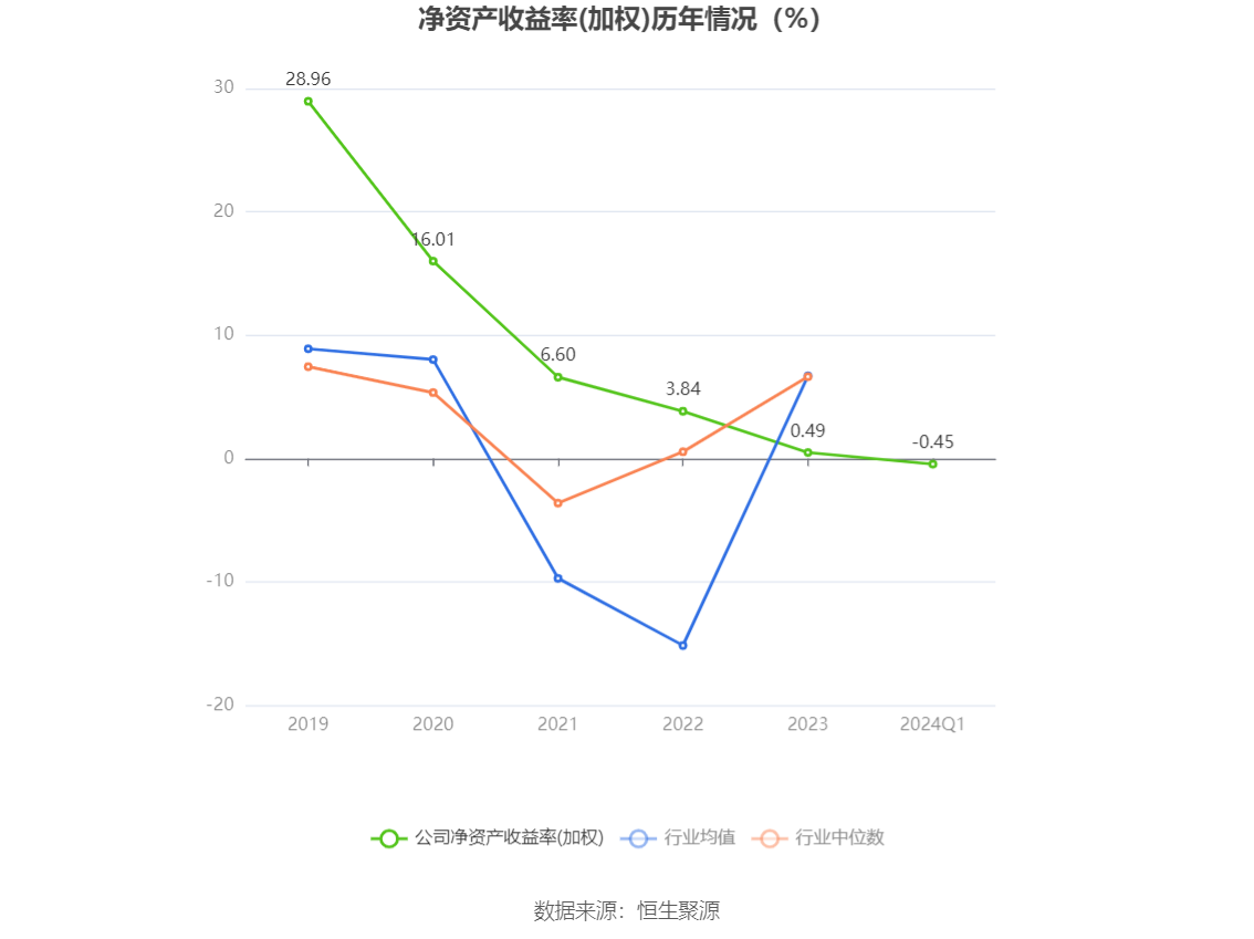 数据显示,2024年第一季度公司加权平均净资产收益率为-0.45%,较上年同期下降2.22个百分点;公司2024年第一季度投入资本回报率为-0.30%,较上年同期下降1.79个百分点。