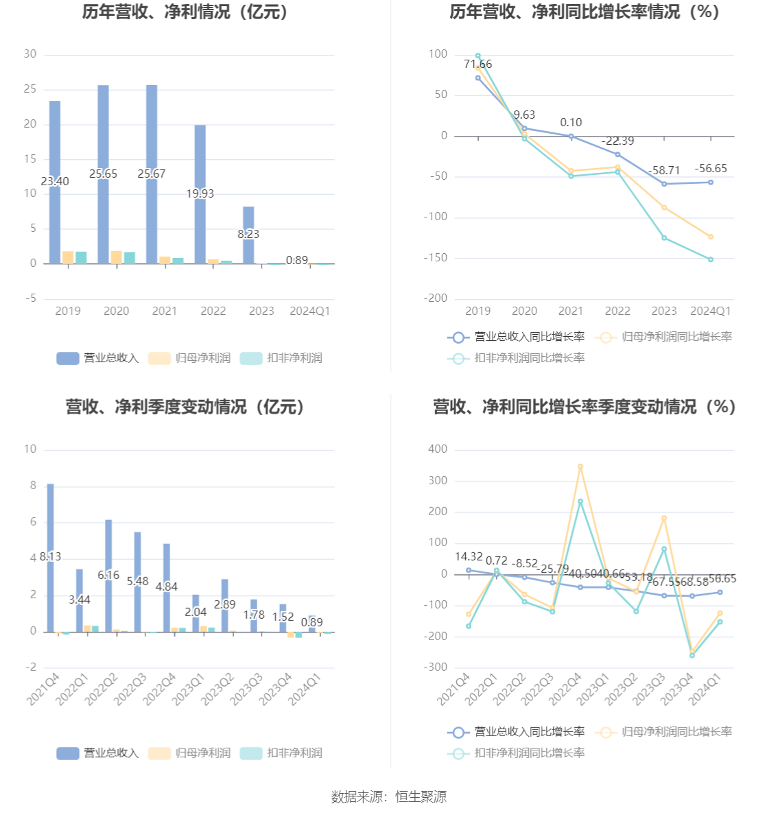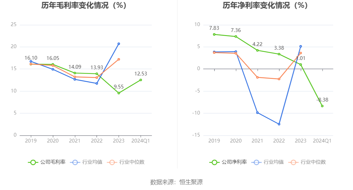 2024年第一季度,公司毛利率为12.53%,同比下降1.61个百分点;净利率为-8.38%,较上年同期下降23.79个百分点。