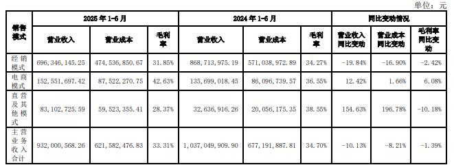 而渠道方面,尽管电商表现尚可,电商渠道收入增长12.42%达到1.52亿元,但传统经销模式大幅下降19.84%,仅收入6.96亿元。各销售模式的毛利率为33.31%,同比下降1.39个百分点。