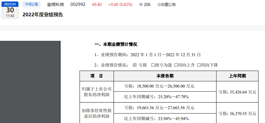 1月30日午间,宝明科技(002992.SZ)发布了《2022年度业绩预告》,宝明科技预计2022年度公司归属于上市公司股东的净利润为亏损1.85亿元~2.65亿元,扣除非经常性损益后的净利润为亏损1.97亿~2.77亿元。