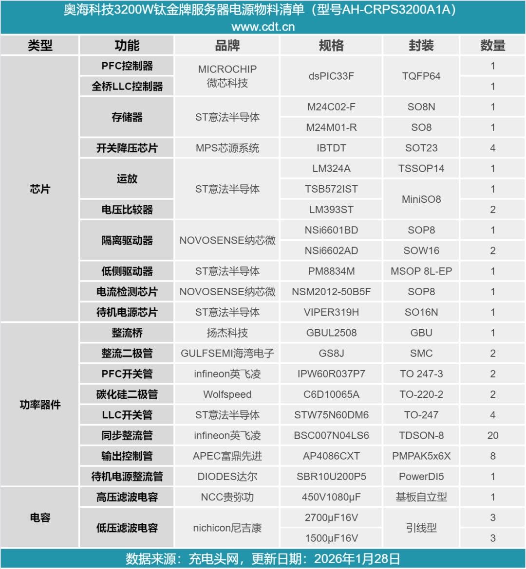 最后附上奥海科技3200W钛金牌服务器电源的核心器件清单,方便大家查阅。
