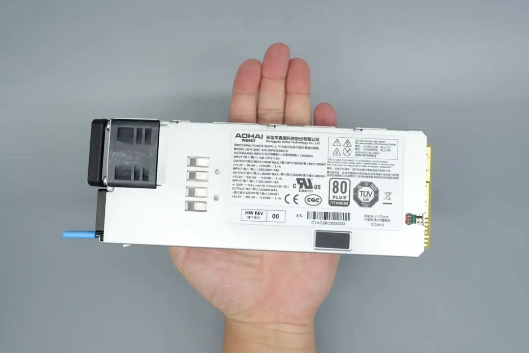 本期拆解带来的是奥海科技3200W钛金牌CRPS电源,电源型号为AH-CRPS3200A1A,支持100-240V交流和240V HVDC输入,通过了80PLUS钛金认证。电源额定输出电压为12.2V,输出电流262.3A,待机电源输出电压为12V,输出电流为2.1A。