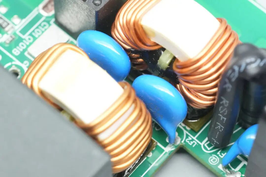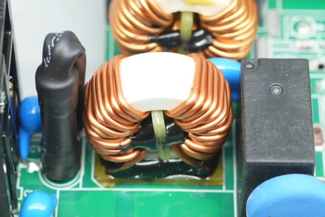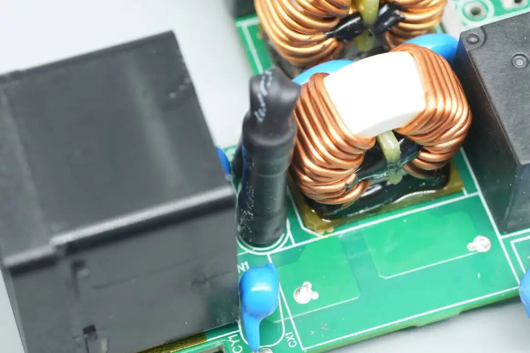 两颗共模电感之间设有两颗蓝色Y电容。