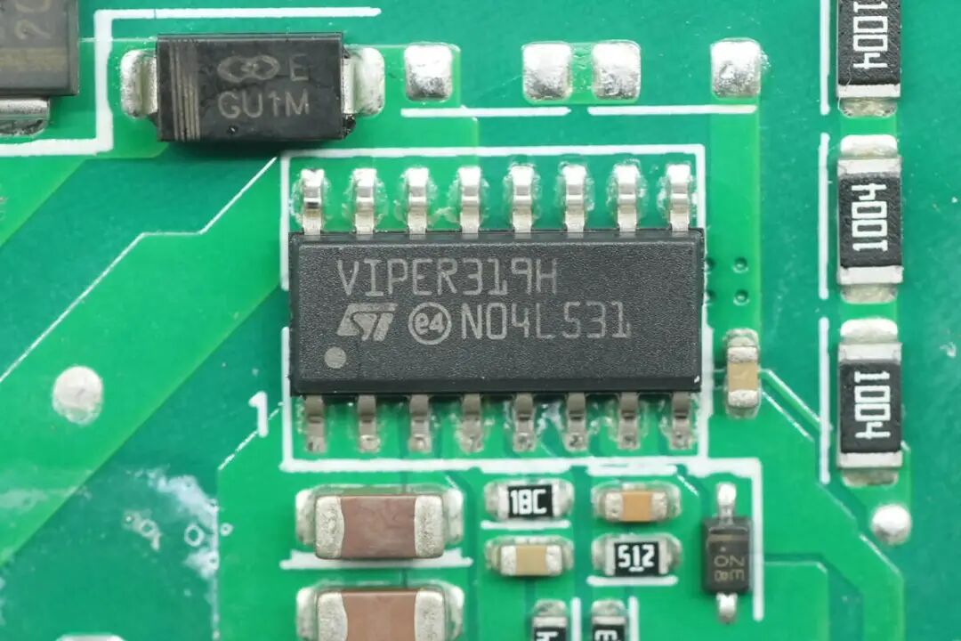 待机电源芯片来自意法半导体,为VIPER31系列,型号VIPER319H,芯片内部集成800V开关管,集成高压启动,采用电流模式控制,开关频率为132KHz,具备过负载保护,过热关闭和过压保护,采用SO16N封装。