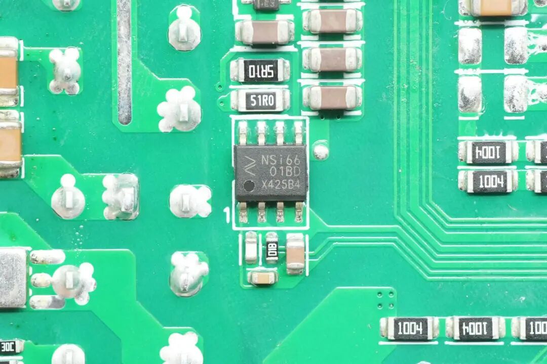 驱动器来自纳芯微,型号NSi6601BD,为单通道隔离驱动器,芯片具备3kV隔离能力,绝壁5A驱动电流能力,支持3.1-17V工作电压,采用SOP8封装。