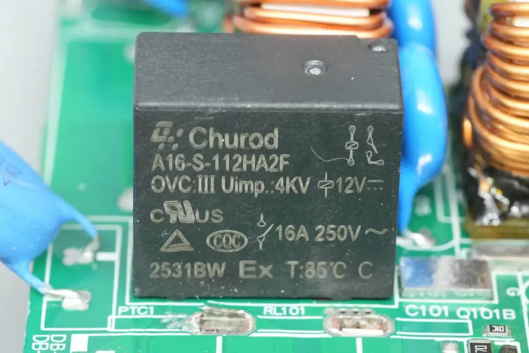 继电器来自中汇瑞德电子,型号A16-S-112HA2F,内置一组常开触点,触点容量为16A 250V~,线圈电压为12V。