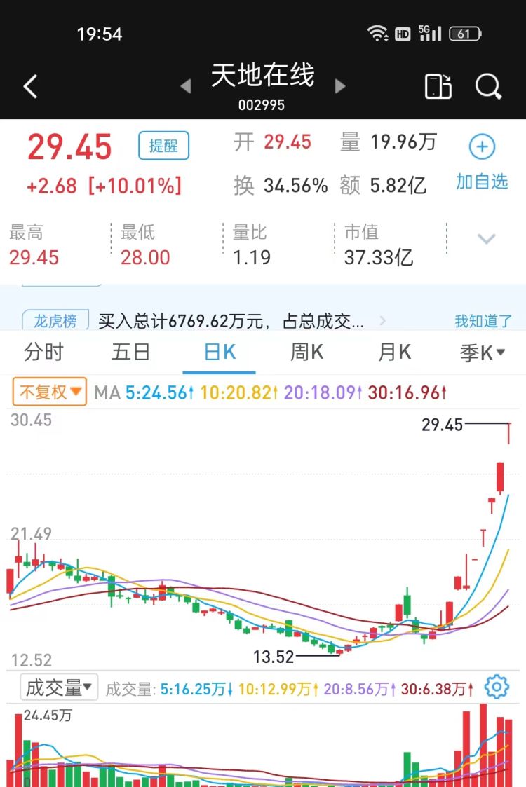 二级市场上,天地在线11月8日涨停,收盘报收于29.45元。
