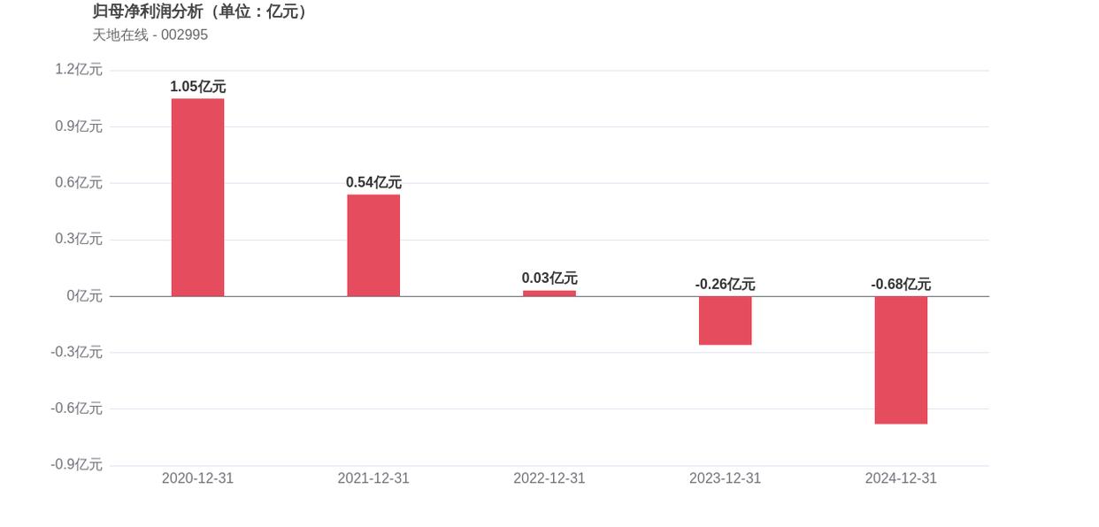 天地在线上市的2020年,当年实现归母净利润1.05亿元。截至最新完整财年的2024年,公司实现-0.68亿元的归母净利润,近年累计下降了164.37%。这5年间,天地在线有2年出现亏损。