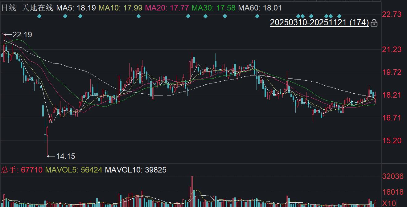 二级市场上,截至11月21日收盘, 天地在线 上涨0.61%报18.11元/股,总市值约32.14亿元,今年来公司股价累计下跌约17%。