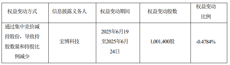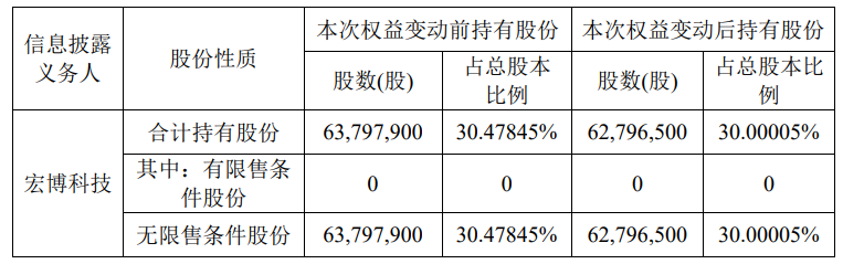 本次权益变动前,宏博科技持有公司63,797,900股,占公司总股本(209,321,325股)的30.47845%。本次权益变动后,宏博科技持有公司62,796,500股,占公司目前总股本(209,321,325股)的30.00005%。宏博科技权益变动比例达0.4784%,权益变动后持股比例触及5%的整数倍。