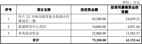 优彩资源的募集资金总额为4.77亿元,扣除发行费用后,募集资金净额为4.32亿元,其中2.47亿元用于年产22万吨功能型复合低熔点纤维项目二期,4931.84万元用于新建研发中心项目,1.36亿元用于补充流动资金。