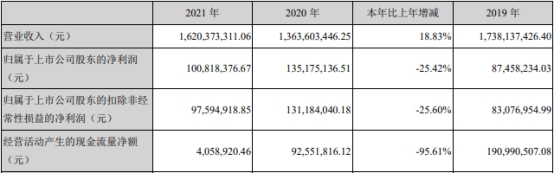 昨日,优彩资源(002998.SZ)披露了2021年年度报告。2021年,优彩资源实现营业收入16.20亿元,同比增长18.83%;实现归属于上市公司股东的净利润1.01亿元,同比减少25.42%;实现归属于上市公司股东的扣除非经常性损益的净利润9759.49万元,同比减少25.60%;经营活动产生的现金流量净额为405.89万元,同比减少95.61%。