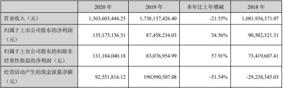 2020年,优彩资源实现营业收入13.64亿元,同比减少21.55%;实现归属于上市公司股东的净利润1.35亿元,同比增长54.56%;实现归属于上市公司股东的扣除非经常性损益的净利润1.31亿元,同比增长57.91%;经营活动产生的现金流量净额为9255.18万元,同比减少51.54%。