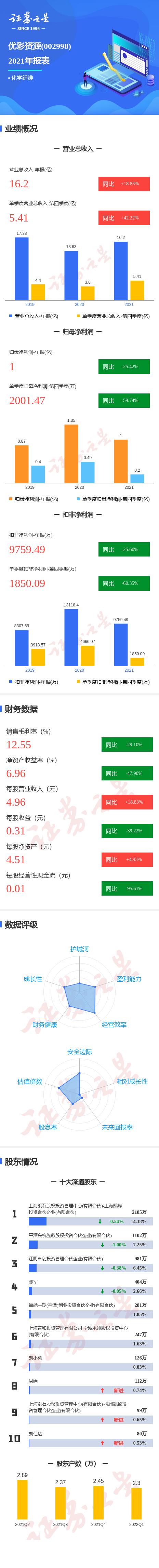 优彩资源2021年报显示,公司主营收入16.2亿元,同比上升18.83%;归母净利润1.01亿元,同比下降25.42%;扣非净利润9759.49万元,同比下降25.6%;其中2021年第四季度,公司单季度主营收入5.41亿元,同比上升42.22%;单季度归母净利润2001.48万元,同比下降59.74%;单季度扣非净利润1850.09万元,同比下降60.35%;负债率20.37%,投资收益-208.57万元,财务费用135.51万元,毛利率12.55%。